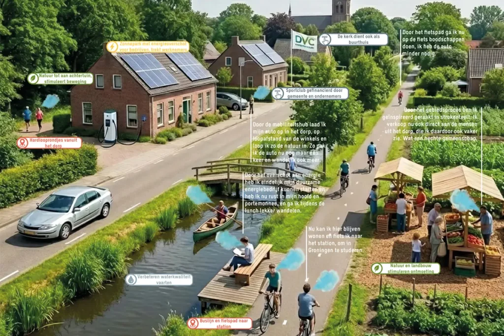 Aderen geven AdemRUIMTE is een bottom-up procesaanpak en ruimtelijk perspectief dat de uniciteit en diversiteit van het gebied als vertrekpunt neemt en verder versterkt. Centraal staat het idee dat bewoners, wanneer zij voldoende ademruimte ervaren, in hun eigen tempo stappen zetten naar een fysiek en mentaal gezonder leven. De aanpak vertrekt vanuit de herkomstlaag (veen, zand en de Vecht) en de daarop gebouwde netwerken die samen vervolgens de gemeenschappen hebben gevormd met allen een eigen DNA-profiel. Per gemeenschap bepalen we samen met die gemeenschap het toekomstbeeld door middel van het inzetten van onze gezondheidsladder. In de gezondheidsladder is positieve gezondheid vertaald naar acht ruimtelijke bouwstenen met bijbehorende toolbox die per ingreep duidelijk maakt wat het ruimtelijk vraagt en wat het oplevert qua gezondheid en geluk. Een sterk Ruimtelijk Regionaal Raamwerk met projectenlijst en governance zorgen voor eigenaarschap en realiteitszin. Adem je met ons mee?