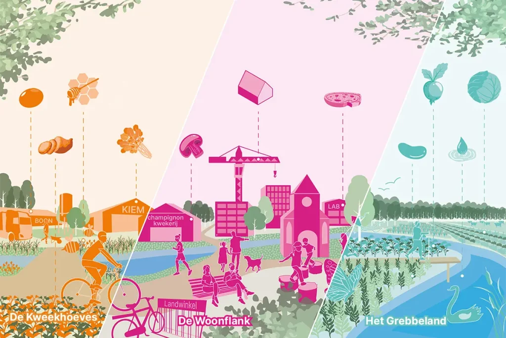 Eiwitrijk Voedselrijk zet in op een herverkaveling op je bord en in het landschap: een nieuwe ordening gericht op plantaardige eiwitproductie. We transformeren Foodvalley tot een innovatieve voedselketen met een gezonde leefomgeving en aantrekkelijk landschap als bijvangst. Het voorstel kent drie samenhangende zones. Het Grebbeland is een productief, biodivers landschap waar de inundatiekommen fungeren als etalage voor nieuwe eiwitgewassen. De Woonflank is een groenblauw dooraderd woon- en werklandschap met vernieuwde erven voor innovatie, wonen en recreatie en beekdalen als structuurdragers. De Kweekhoeves zijn het innovatieve en technologische hart waar de bestaande agrarische kennis en infrastructuur wordt ingezet voor plantaardige eiwitproductie. Zo ontstaat een toekomstbestendig landschap waarin landbouw, wonen en natuur elkaar versterken. De inzet is een drastische reductie van de ecologische voetafdruk en positionering van de regio als wereldwijd koploper in de eiwittransitie.