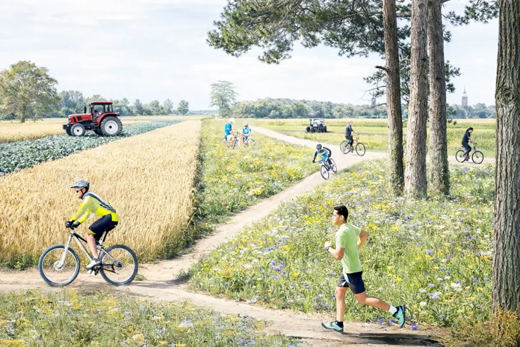 Nieuwe wegen voor een gezonde Foodvalley bouwt aan een gezonde, toekomstbestendige leefomgeving voor mens, dier en natuur. Het voorstel richt zich op het verbeteren en uitbreiden van een fijnmazig recreatief fietsnetwerk in het landelijk gebied langs de westflank van de Veluwe. Door slimme koppelingen tussen natuur, landbouw en verstedelijking ontstaat een aantrekkelijker landschap dat beweging stimuleert, recreatiedruk op kwetsbare natuur vermindert en nieuwe kansen biedt voor duurzame landbouwtransities. Innovatieve samenwerking tussen ontwerpers, natuurorganisaties en een toerfietsunie maakt het mogelijk om routes, knooppunten en bestemmingen te ontwikkelen die gezondheid, biodiversiteit en regionale mobiliteit versterken. Het netwerk fungeert als groene aders tussen stad, land en natuur en vormt een katalysator voor water- en bodemverbetering. De Foodvalley dient als eerste voorbeeldgebied met een aanpak die later in andere regio’s kan worden toegepast.