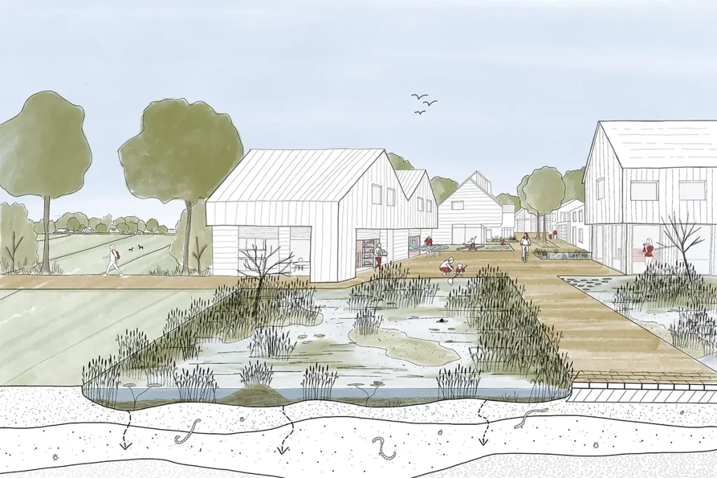 De Drents-Overijsselse hoogveenontginningen zijn jarenlang de motor geweest van welvaartsgroei in West-Nederland. Vanuit een verleden van uitbuiting, waar mensen in ongezonde omstandigheden en armoede leefden, zijn generaties later nog steeds de nawerkingen zichtbaar als brede welzijnsopgaven. Tegelijkertijd is de vervening ook een sterk gedeeld verleden dat leidt tot regionale trots en eigenheid. Ons voorstel heet Onder Ons, verwijzend naar de ondergrond als leidend principe – bodem en water sturend – maar gaat ook over het samendoen, delen in een gemeenschap en je gegrond voelen aan een plek. Het zet in op het herstel van de hoogveenecologie die door ontginning is verdwenen. In dit landschap creëren we buurtjes rondom samenwoon- en leefconcepten waar de gemeenschapszin wordt aangesproken. In de regio staan gelukkig wonen, leven, bewegen en gezond ouder worden centraal. Zo brengen we de Drents-Overijsselse hoogveenontginningen weer hogerop.